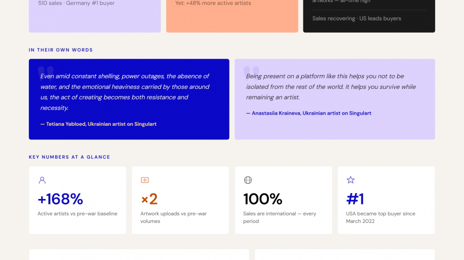 Between March and December 2022, the impact was immediate and measurable. Sales of Ukrainian artists' works on the platform fell by 68%, and artwork uploads dropped by 65%. Yet during that same period, the number of active artists rose by 48%. Artists were not waiting for conditions to improve, they took their fate in their own hands.