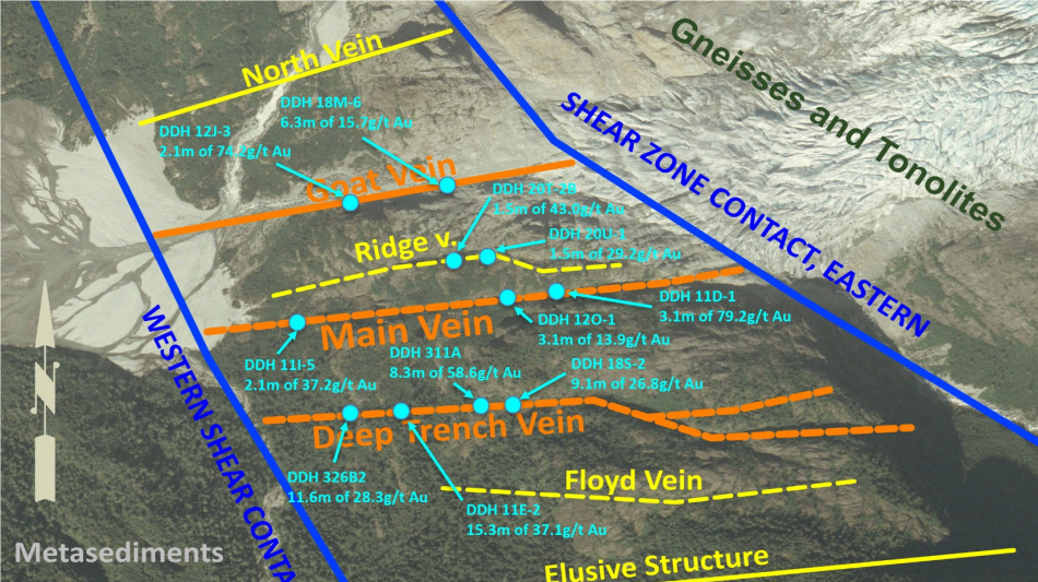 Deep Trench Vein: 15.3m grading 37.1 g/t Au, 8.3m grading 58.6 g/t Au, 11.6m grading 28.3 g/t Au